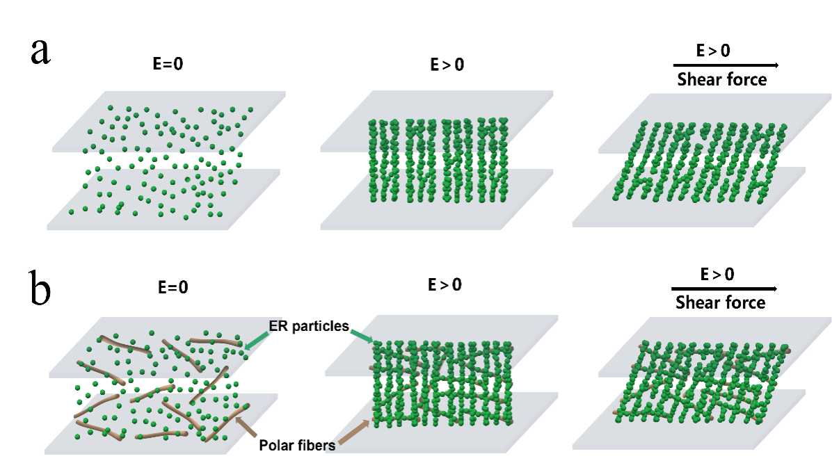图:在电场下,未添加和添加极性纤维的ER流体链状结构演变示意图。