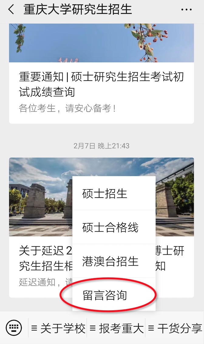考生可通过电脑PC端登录公司“研究生招生服务系统”(网址:http://syk.cqu.edu.cn)或手机关注公司研招办微信公众号,在“报考重大”菜单内进入“留言咨询系统”。详细操作如下图所示: