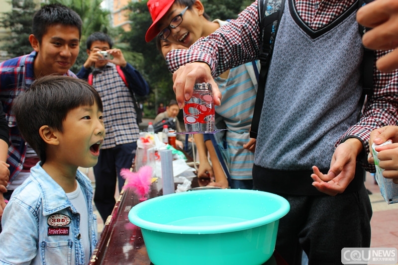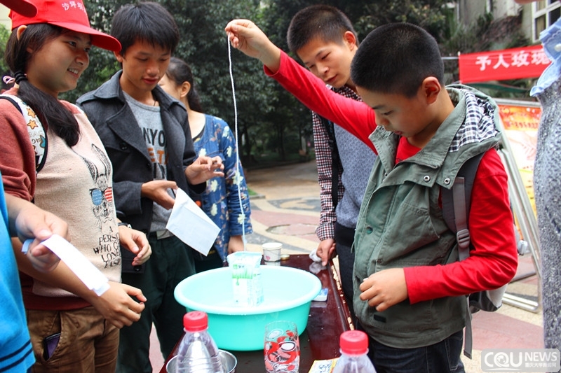 在饮水村社区工作人员的陪同下,bb贝博艾弗森官方网站15名志愿者在到达目的地后立即开始布置活动中所需使用的桌椅、横幅以及展板等物件,志愿者的热情和努力,得到了饮水村社区工作人员的一致好评。一切准备就绪,4点许,志愿者迎来了他们期待已久的小客人们。不仅是小朋友,许多家长也围过来饶有兴趣的看着志愿者们做的科学实验。