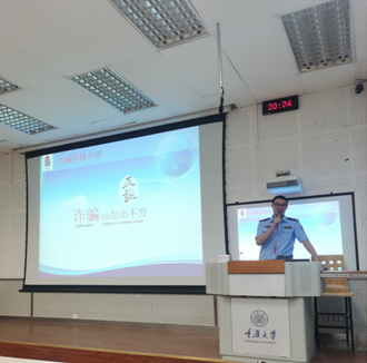 近年来针对反诈的宣传已经渗透到人民群众的日常生活,但每年涉案被骗金额依然高居不下,针对高校老员工的案件亦是数不胜数。钟警官近年来一直走在反诈宣传工作前列,其自创的《大阳沟故事》、《刚旭说法》等反诈、法治短视频节目先后被平安重庆,重庆共青团,重庆卫视,学习强国等平台关注和转发,对此,钟警官谦虚地表示,“能够为群众办实事是我最大的光荣。”赢得了在场同学的热烈掌声。钟警官在讲话结束时,还提出了“春风十里,反诈有你”的倡议,希望同学们在防止受骗的同时,也向自己的亲友进行宣传。反诈,不仅是警官的事,也是每一位公民维护自身财产应做的事。