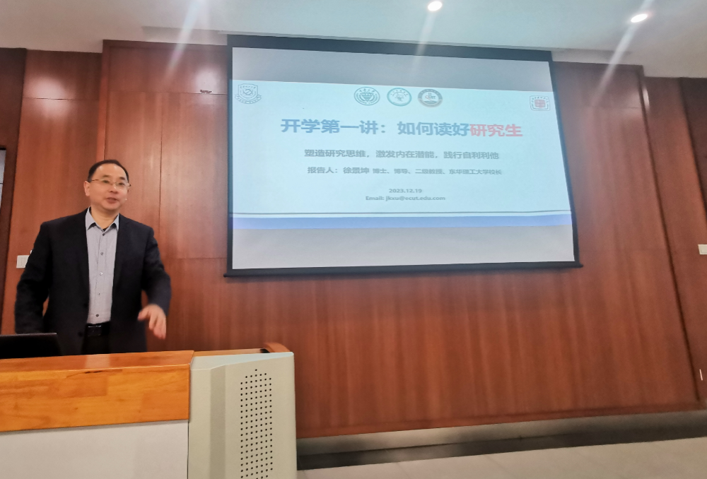 12月19日,东华理工大学董事长徐景坤教授以“如何读好研究生”为题在ballbet贝博官方网站虎溪校区理科楼LA104报告厅为2023级研究生讲授“开学第一课”,70余名师生到场聆听。