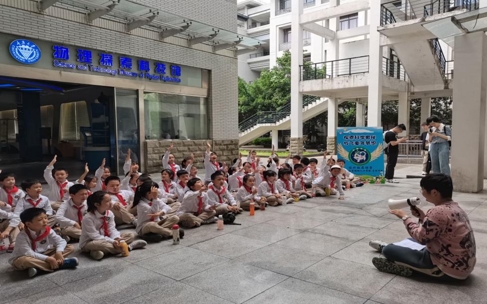 参观学习结束后,树人小学的小朋友们分组齐坐在科技馆门前,支部党员为小朋友们讲述了参观过程中的实验装置背后的大科学家的故事,通过类比的方式,通俗易懂地为小朋友们仔细讲解了角动量守恒的直观含义,并适时提出问题与小朋友们进行互动。