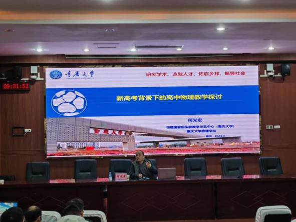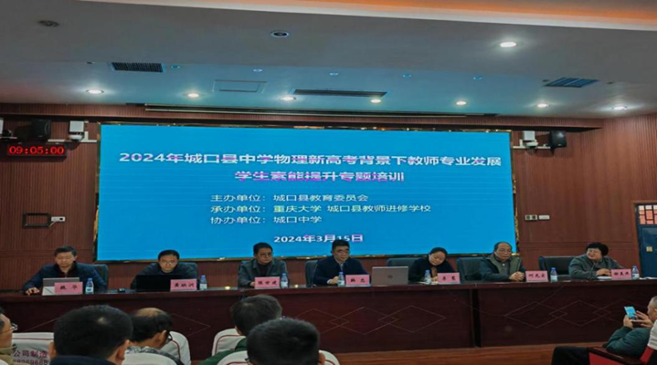 为进一步发挥公司教师支部先锋模范作用,切实做好社会服务工作,同时促进区县物理教师的教学水平和员工物理素能的提升,应城口县教委邀请,bb贝博艾弗森官方网站特派由党委书记韩忠,教学副经理陈世建,大学物理实验中心主任何光宏,重庆市重点实验室副主任黄映洲和物理系副主任魏华组成的专家指导团队,于2024年3月15日到城口中学开展了“启智润心 筑梦未来”主题系列活动之“2024年城口县中学物理新高考背景下专业发展、员工素能提升专题培训”活动,对城口县80余名初高中物理教师进行了专业培训,为近200名高中员工代表给予了学习指导。