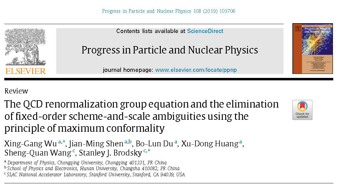 近几年,吴兴刚教授课题组又取得了一系列重要的进展,包括提出全新的PMC有效单能标方案 进一步压低前述第一种和第二种方案中存在的因未计算的高阶项所导致的残余能标不确定性;完成严格证明,PMC给出的理论预言值与重整化方案的选择无关;将PMC应用于分析欧洲大型强子对撞机新近获得的多项实验数据(如希格斯粒子衰变、顶夸克对产生、重夸克偶素产生等过程),很好地解释了相应的实验数据;提出基于PMC共形表达式来预言未知高阶的贡献的新方法;等等。在这些工作当中,课题组的多名硕士生和博士生起到了非常重要的作用。鉴于这些新的重要进展,《粒子物理和核物理进展》主编Faessler教授于2018年再度邀请课题组撰写综述。经过近一年时间的写作,特别是在