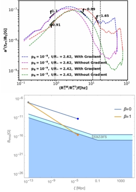 图2:左上:电弱一阶相变产生的磁场能谱;左下:磁场后期演化预言的现在的磁场强度和关联尺度;右上:相变预言的引力波能量谱;右下:预言的引力波有机会被多种探测器观测到