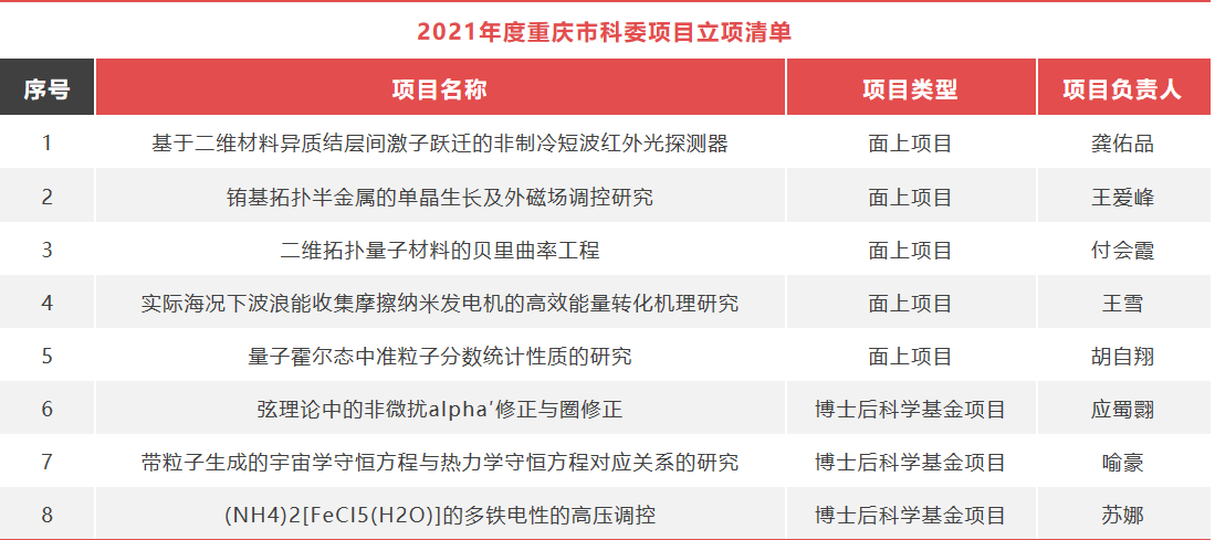 近日,重庆市科技局发布了《2021年度重庆市自然科学基金专项拟立项清单公示》,公司立项重庆市自然科学基金面上项目5项、博士后科学基金项目3项(见附表)。据悉,ballbet贝博官方网站共立项2021年度重庆市自然科学基金面上项目106项、博士后科学基金项目46项。
