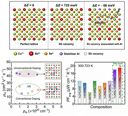 近日,来自bb贝博艾弗森官方网站新能源材料与器件课题组报道了一种高效率提高半导体的载流子浓度并且保持高迁移率的非常规掺杂效应。在这项工作中,作者通过实验表征和理论计算, 将CuAlSe2复合于Cu3SbSe4基体上,引入微量的外来原子Al来稳定Cu3SbSe4中的Sb阳离子空位。结果表明,在“稳定原子”Al的帮助下,Sb位置原子的空位形成能降低,在高效率提升载流子浓度的同时,对载流子的迁移率影响甚微,从而达到优化热电材料电学输运性能的目的。比起常规掺杂手段,非常规掺杂方式显示出更高效率的电性能协同优化(载流子浓度与迁移率)。同时,这项工作在热电性能的优化上取得了突出成绩,例如,在673 K时获得峰值功率因子为20 μW cm–1 K–2,且在300~723 K的温度范围内平均功率因子为19 μW cm–1 K–2,平均热电优值提升到0.72,均为目前铜基类金刚石结构的热电材料报道的最高数值。
