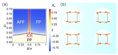 图1(a)N=4的磁性模型量子相图:铁磁相(FP),反铁磁相(AFP),手性磁性相(CP),以及顺磁相(pp);(b)手性磁性相中,4格点平面内的自旋结构,类似磁性斯格明子。