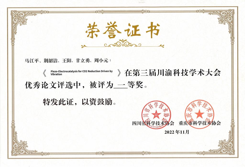 2022年11月23日,由四川省科学技术协会、重庆市科学技术协会联合举办的第三届川渝科学技术大会在成都举行,本届大会主题为“潜心学术研究 引领科技创新”。开幕式上,大会公布了年度川渝最具影响力学术活动、年度川渝一流学会、年度川渝一流科技期刊以及第三届川渝科技学术大会优秀论文获奖名单。公司周小元教授团队发表的论文《Piezo-electrocatalysis for CO2 Reduction Driven by Vibration》荣获第三届川渝科技学术大会优秀论文一等奖。