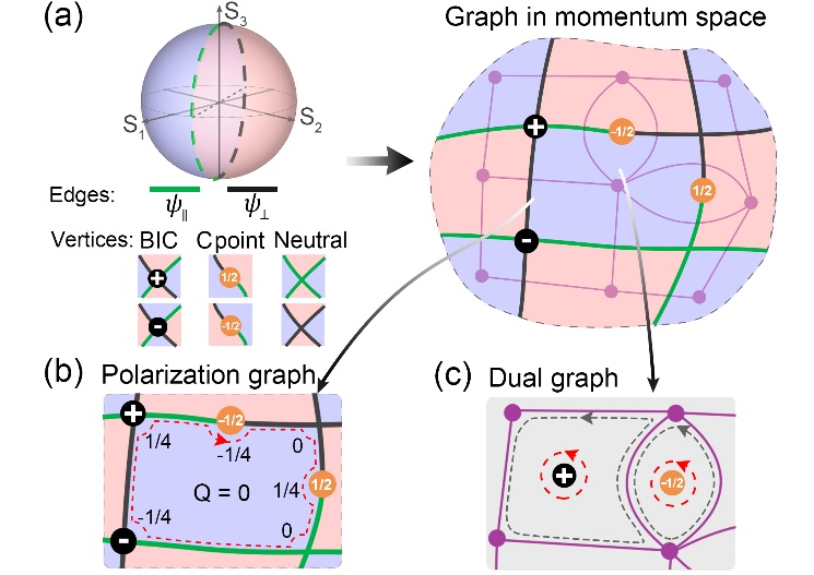 图. 动量空间中的偏振图。(a)偏振图及其对偶图。BIC和C点分别对应偏振图中不同颜色边的交点和连接点。(b)偏振图中面的拓扑荷为零。(c)对偶图中面的拓扑荷等于偏振图中对应顶点的拓扑荷。