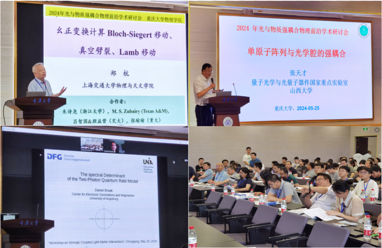 2024年5月24-27日,由bb贝博艾弗森官方网站、西南理论物理中心、重庆量子物理基础学科研究中心和重庆物理学会主办的2024年光与物质强耦合物理前沿学术研讨会在ballbet贝博官方网站虎溪校区顺利召开。此次会议聚焦量子光学中光与物质相互作用在强耦合、超强耦合的实验和理论研究进展,旨在增进光与物质强耦合研究领域内的交流与合作,共同探索该领域的新思想、新方法和新方向。会议邀请了上海交大、浙江大学、山西大学、湖南师范大学、德国Augsburg大学、澳洲国立大学等高校和中国科公司精密测量科学与技术创新研究院、中国工程物理研究院研究生院、中国科公司理论物理研究所、北京量子信息科学研究院等科研院所的30余位专家学者做精彩报告,共计150余人参加了会议。本次研讨会由bb贝博艾弗森官方网站量子光学与强关联量子多体团队张瑜瑜教授和胡自翔教授组织,得到国家自然科学基金“西南理论物理中心”项目的资助。