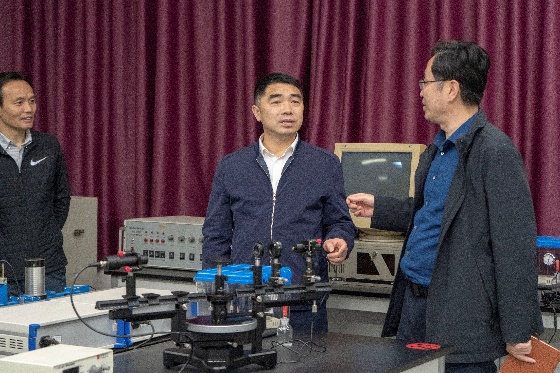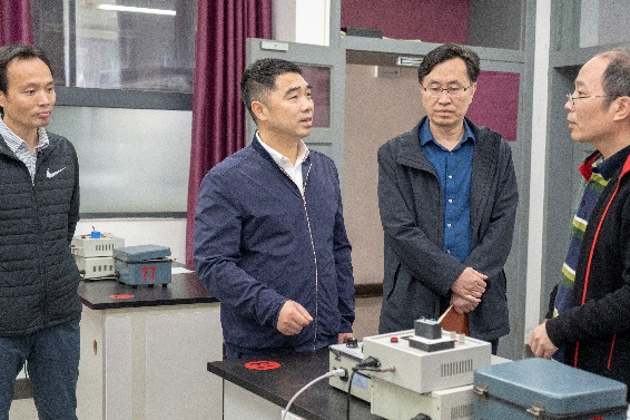 在近代物理实验室,卢义玉副董事长参观了中心自主研发的原子力显微镜,肯定了中心“源于教学,服务教学,超越教学”的仪器研发理念,对自主研发的设备给予了高度评价。在单臂电桥实验室,强调实验项目要与时俱进,体现当代科技发展水平。