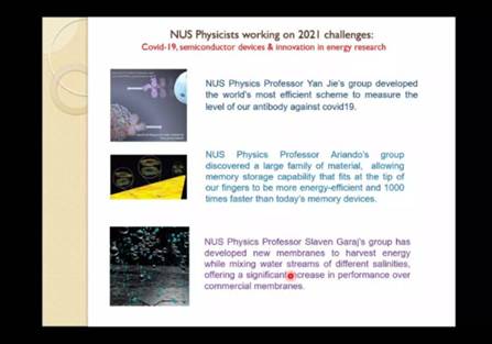 龚江滨教授为同学们介绍了NUS物理系的悠久历史。NUS物理学拥有超过90年历史,在2021QS世界大学物理与天文学专业排名第15位。系内拥有众多先进实验室其中起源于新国大物理系的量子科技研究中心是新加坡政府资助的首个卓越研究中心。多年来,新国大物理系与工业界、海外高校和政府部门紧密合作,积极开展跨学科研究与教学,在推动新加坡迈入高科技时代的进程中扮演着重要角色。